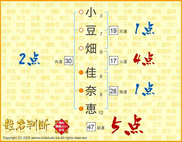 小(3画)豆(7画)畑(9画) 佳(8画)奈(8画)恵(12画)