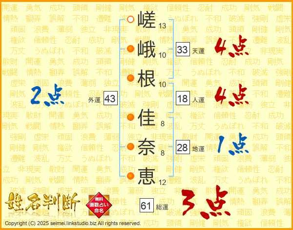 嵯峨根佳奈恵さんの総運は61画の3点!