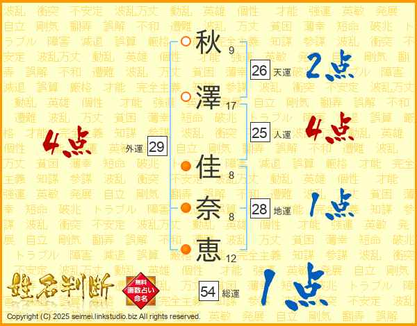 秋(9画)澤(17画) 佳(8画)奈(8画)恵(12画)