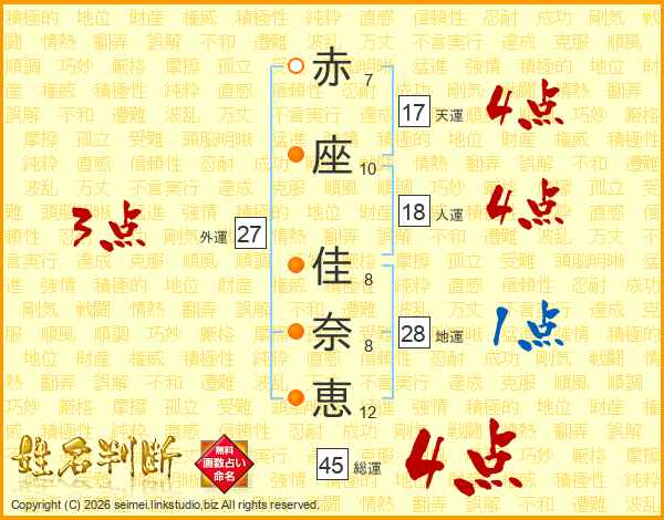 赤(7画)座(10画) 佳(8画)奈(8画)恵(12画)