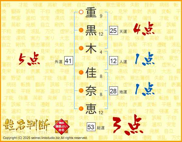 重(9画)黒(12画)木(4画) 佳(8画)奈(8画)恵(12画)