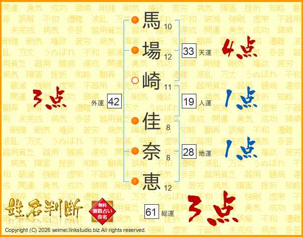 馬場崎佳奈恵さんの天運は33画の4点!