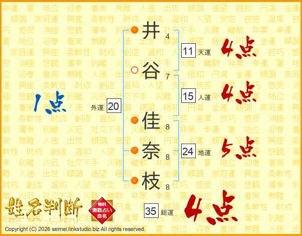 井(4画)谷(7画) 佳(8画)奈(8画)枝(8画)
