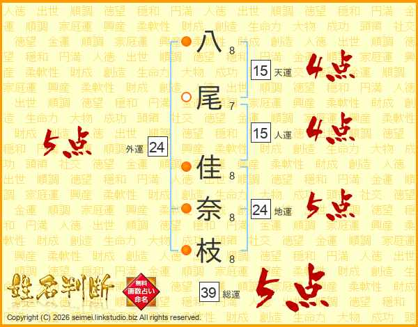 八(8画)尾(7画) 佳(8画)奈(8画)枝(8画)