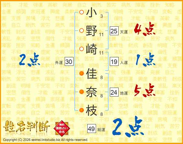 小(3画)野(11画)崎(11画) 佳(8画)奈(8画)枝(8画)