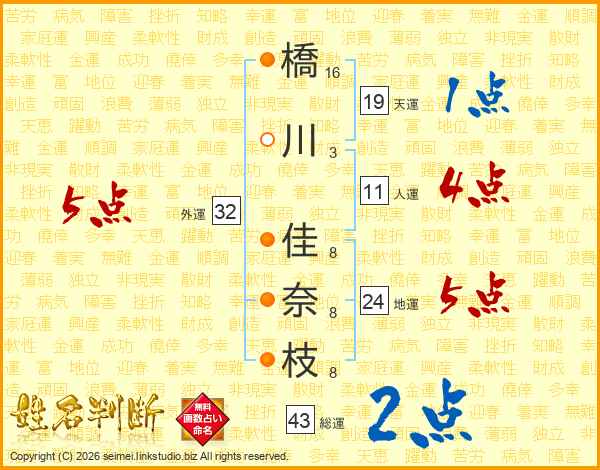 橋(16画)川(3画) 佳(8画)奈(8画)枝(8画)