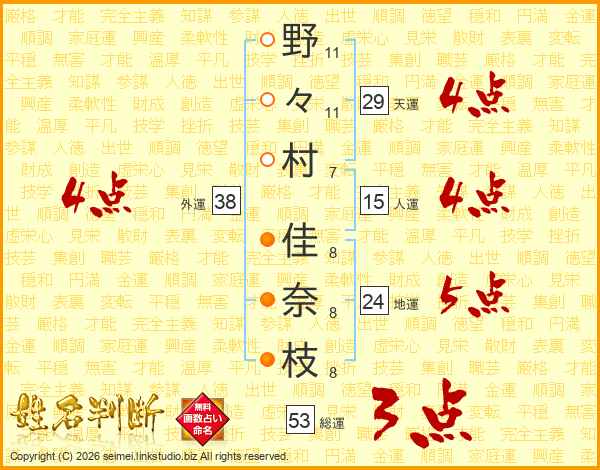野(11画)々(11画)村(7画) 佳(8画)奈(8画)枝(8画)