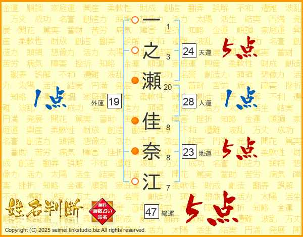 一(1画)之(3画)瀬(20画) 佳(8画)奈(8画)江(7画)