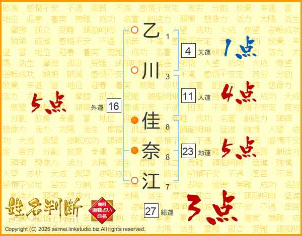 乙川佳奈江さんの総運は27画の3点!