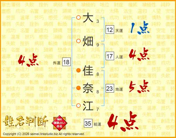 大(3画)畑(9画) 佳(8画)奈(8画)江(7画)