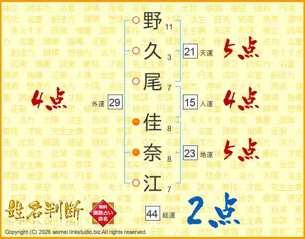 野(11画)久(3画)尾(7画) 佳(8画)奈(8画)江(7画)