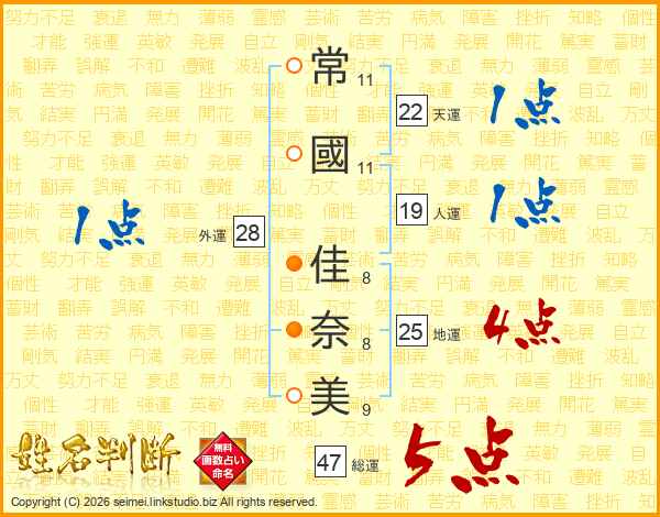 常(11画)國(11画) 佳(8画)奈(8画)美(9画)