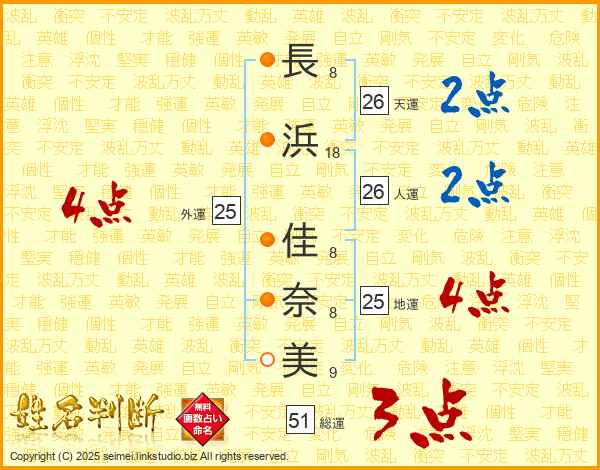 長(8画)浜(18画) 佳(8画)奈(8画)美(9画)