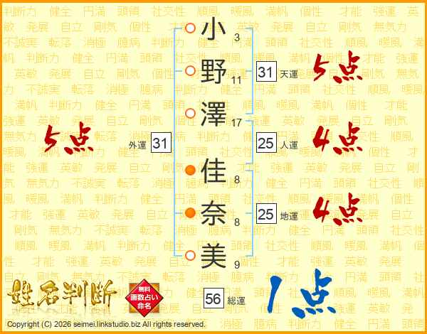 小野澤佳奈美さんの天運は31画の5点!