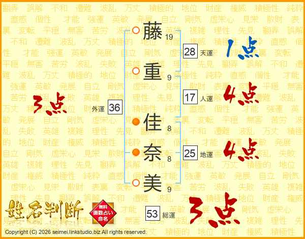 藤(19画)重(9画) 佳(8画)奈(8画)美(9画)