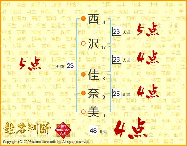 西(6画)沢(17画) 佳(8画)奈(8画)美(9画)