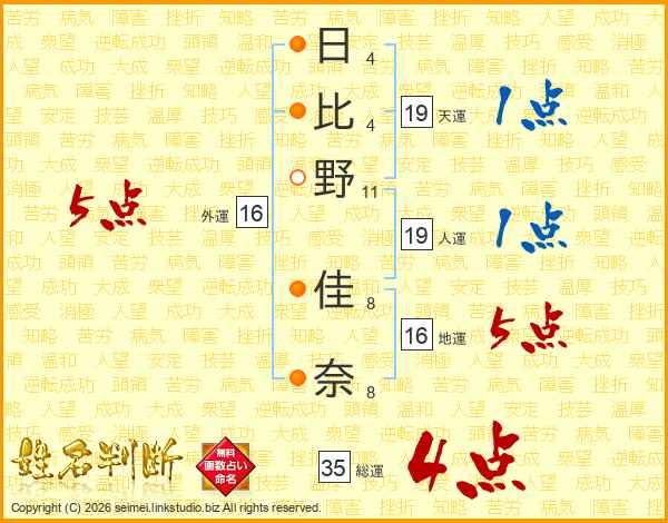 日(4画)比(4画)野(11画) 佳(8画)奈(8画)