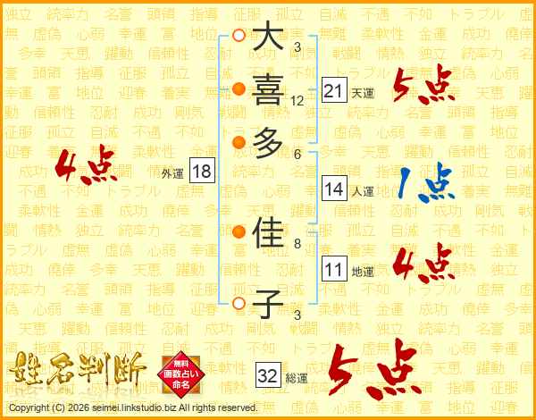 大(3画)喜(12画)多(6画) 佳(8画)子(3画)