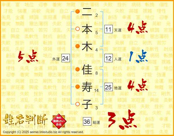 二(2画)本(5画)木(4画) 佳(8画)寿(14画)子(3画)
