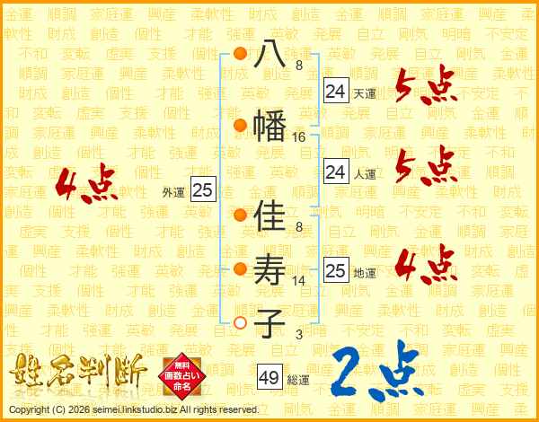 八幡佳寿子さんの総運は49画の2点!
