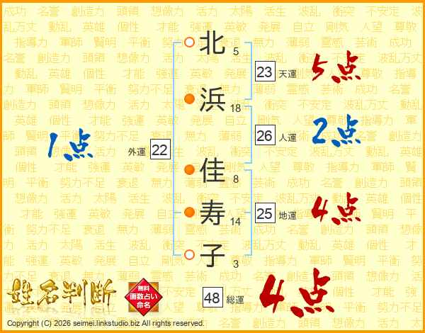 北(5画)浜(18画) 佳(8画)寿(14画)子(3画)