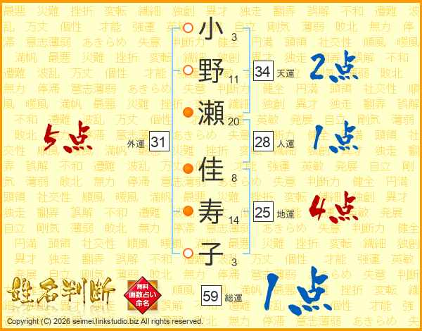 小(3画)野(11画)瀬(20画) 佳(8画)寿(14画)子(3画)