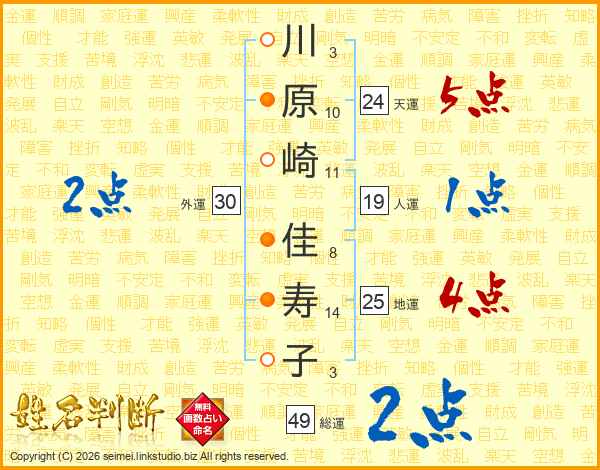 川(3画)原(10画)崎(11画) 佳(8画)寿(14画)子(3画)