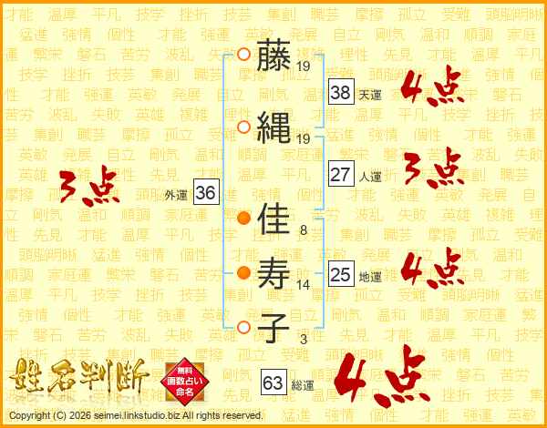 藤(19画)縄(19画) 佳(8画)寿(14画)子(3画)