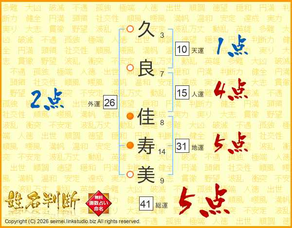 久(3画)良(7画) 佳(8画)寿(14画)美(9画)