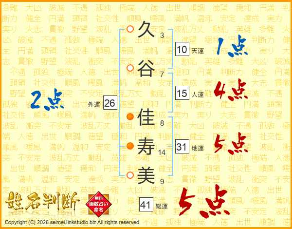 久(3画)谷(7画) 佳(8画)寿(14画)美(9画)