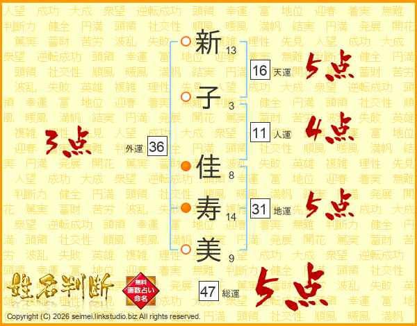 新(13画)子(3画) 佳(8画)寿(14画)美(9画)