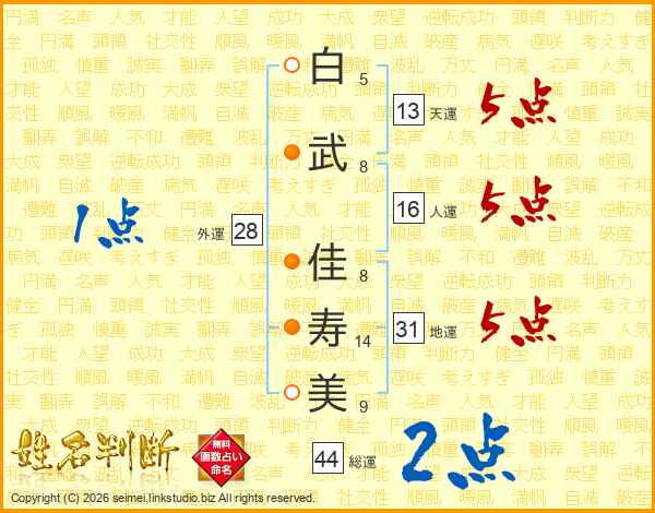 白(5画)武(8画) 佳(8画)寿(14画)美(9画)