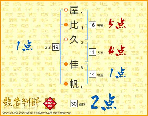 屋(9画)比(4画)久(3画) 佳(8画)帆(6画)
