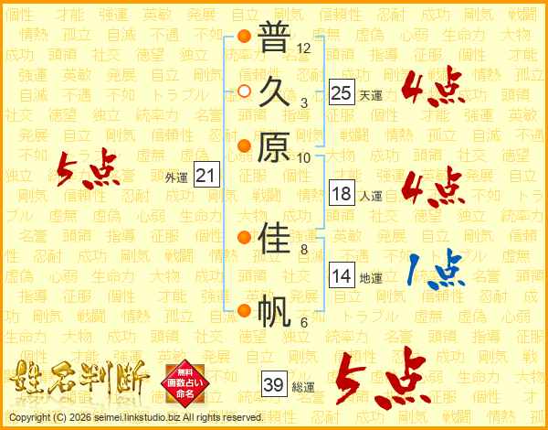 普(12画)久(3画)原(10画) 佳(8画)帆(6画)