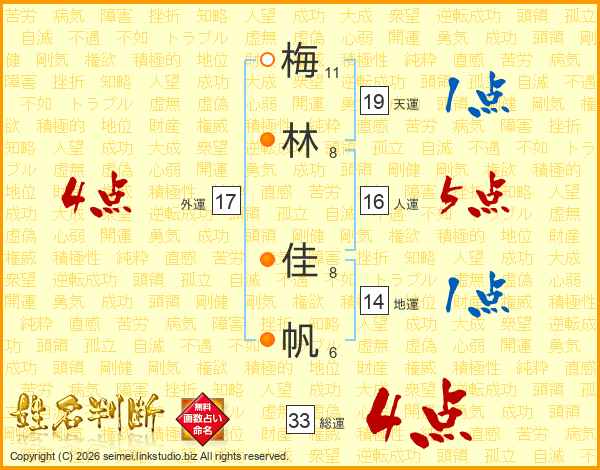 梅(11画)林(8画) 佳(8画)帆(6画)