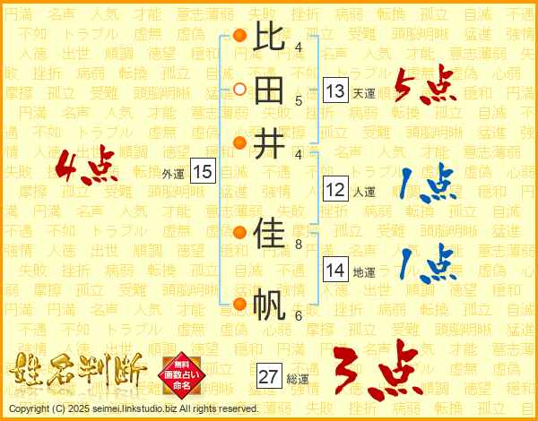 比(4画)田(5画)井(4画) 佳(8画)帆(6画)