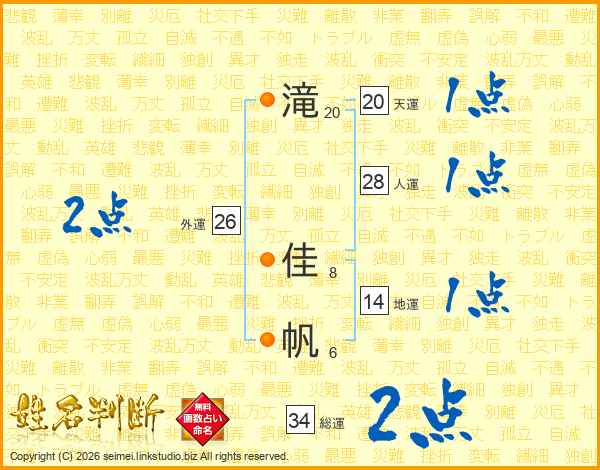 生活面を象徴する運勢です。外部から受ける影響力を表し、結婚運、家庭運や職場、環境への順応性を表します。総運から人運を引いた画数。姓や名が1文字の場合を除く。
