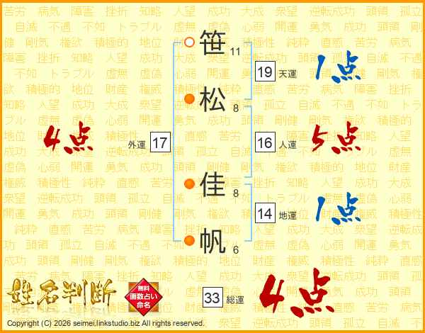 笹(11画)松(8画) 佳(8画)帆(6画)