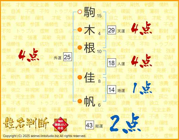 駒(15画)木(4画)根(10画) 佳(8画)帆(6画)