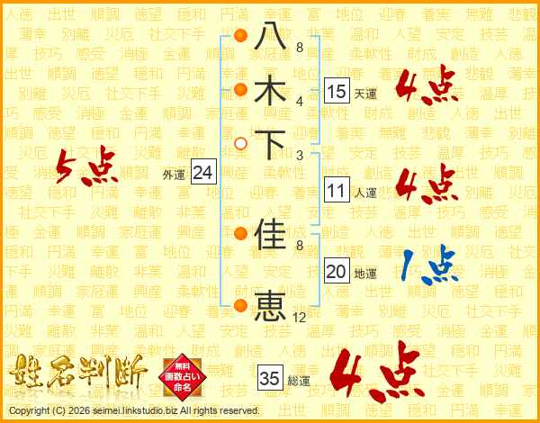 八(8画)木(4画)下(3画) 佳(8画)恵(12画)