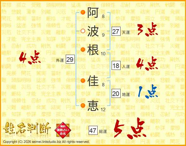 阿(8画)波(9画)根(10画) 佳(8画)恵(12画)