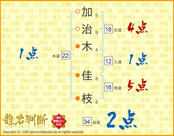 加(5画)治(9画)木(4画) 佳(8画)枝(8画)