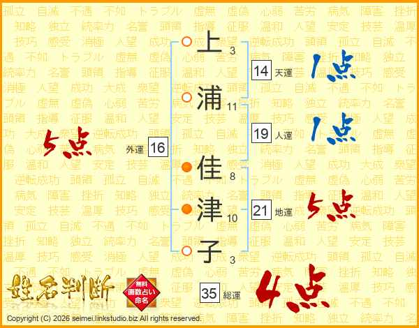 上(3画)浦(11画) 佳(8画)津(10画)子(3画)