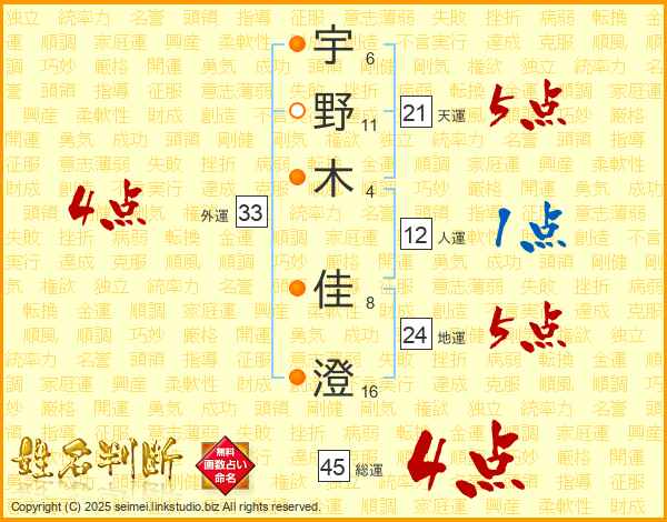 宇(6画)野(11画)木(4画) 佳(8画)澄(16画)