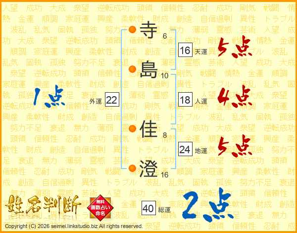 寺(6画)島(10画) 佳(8画)澄(16画)