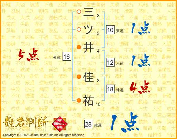 三(3画)ツ(3画)井(4画) 佳(8画)祐(10画)