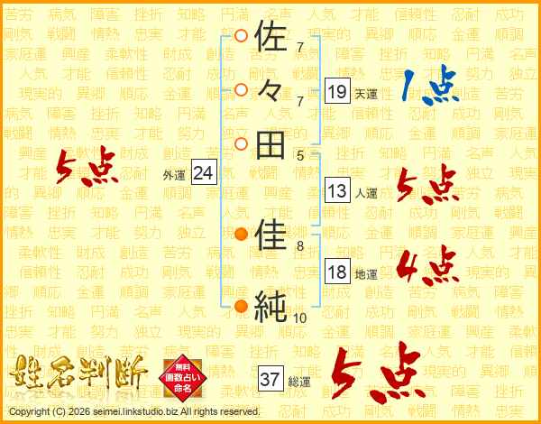 佐(7画)々(7画)田(5画) 佳(8画)純(10画)