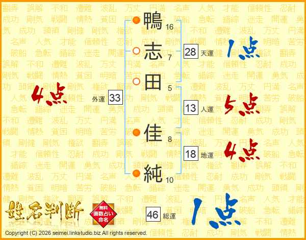 鴨(16画)志(7画)田(5画) 佳(8画)純(10画)