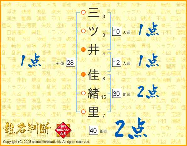 三(3画)ツ(3画)井(4画) 佳(8画)緒(15画)里(7画)