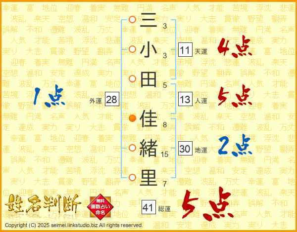 三(3画)小(3画)田(5画) 佳(8画)緒(15画)里(7画)
